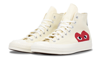 With a look inspired by the Converse Chuck Taylors of the ?aa??70s, the Converse Chuck Taylor All Star 70s Hi Comme des Garcons PLAY White has a high-top that blends the collab branding and collaboration. Converse Chuck Taylor All Star 70s Hi Comme des Garcons PLAY White has a white canvas upper with double stitching and shiny metal eyelets. It also features heart icons on the sidewall. The lower part of the shoe mostly features a vulcanized rubber midsole and outsole.