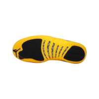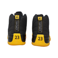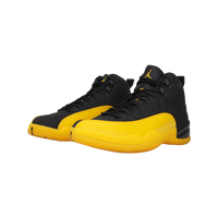 The Jordan 12 University Gold features a black tumbled leather upper with University Gold overlays and accents. Jordan ??Two Threeaa??branding on the tongue and a yellow sole complete the design.