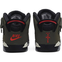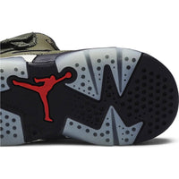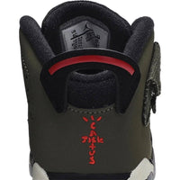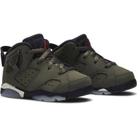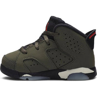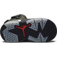 The Travis Scott x Air Jordan 6 Retro TD is a military-inspired interpretation of the icon's classic design lines. Arrived in October 2019, this kids' option presents an Olive nubuck upper with a frayed tongue, Infrared co-branding embroidered on heel and 3M reflective accents. Scott's signature stash pocket dons the ankle. The sneaker's Air-imbued midsole and rubber outsole are updated with a glow-in-the-dark treatment.