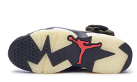 The Travis Scott x Air Jordan 6 Retro 'Olive' represents a collaboration between the Houston based rapper and Jordan Brand. This take on the AJ 6, which Scott debuted while performing during halftime of Super Bowl 53, released in October 2019. It features a Medium Olive, black, Sail and University Red colorway along with several unique elements: a small pocket with a snap on the collar, a nubuck and suede upper, Scott's 'Cactus Jack' logo on the heel and a glow-in-the-dark translucent outsole.
