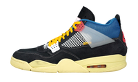 The Air Jordan 4 Union LA Off Noir features a mixture of materials and colors. The upper is constructed out of black, white, and blue mesh, suede, and nylon. Hits of, what looks like infrared, can be found on the Nike Air heel and the tip of the wings.