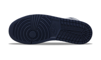 Like the OG Air Jordan 1, this shoe boasts a leather upper, a cushioned midsole, and a roughened rubber outsole. Its upper leather features a white base contrasted by obsidian overlays, a perforated toebox, a grayish nylon tongue, white laces, obsidian swooshes, a white Air Jordan Wings logo on its neck collar, and a metallic gold Jumpman logo on its tongue tag.