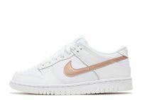 The Nike Dunk Low White Pink (GS) is dressed in smooth perforated white leather from heel to toe. Baby pink leather Swooshes appear on the medial and lateral sides, providing some color to the mostly white silhouette. Nike branding appears in white on the tongue tag, embroidered text on the heel tab, and insoles. An all-white sole unit (midsole and rubber outsole) completes the clean, monochromatic design.